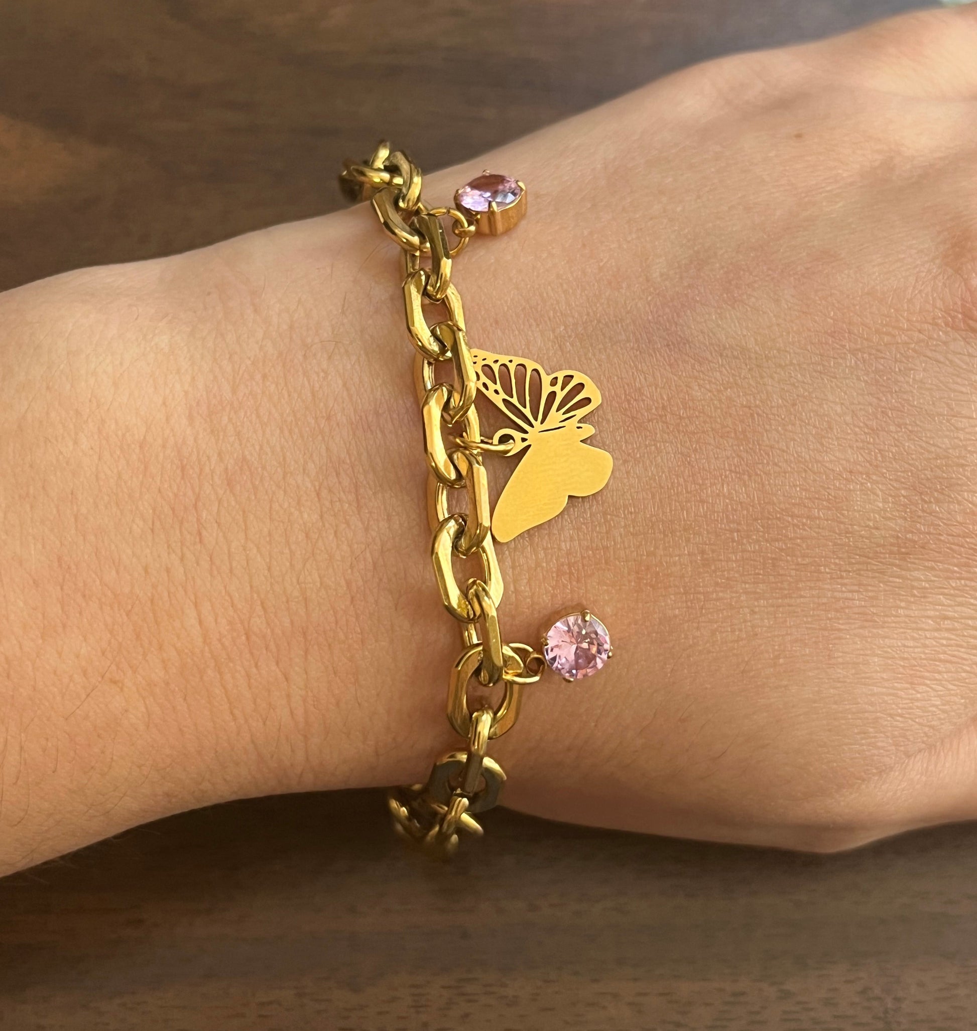 The “Becoming” Butterfly charm bracelet features a butterfly with one wing beautifully detailed and the other smooth and solid — a symbol of becoming.